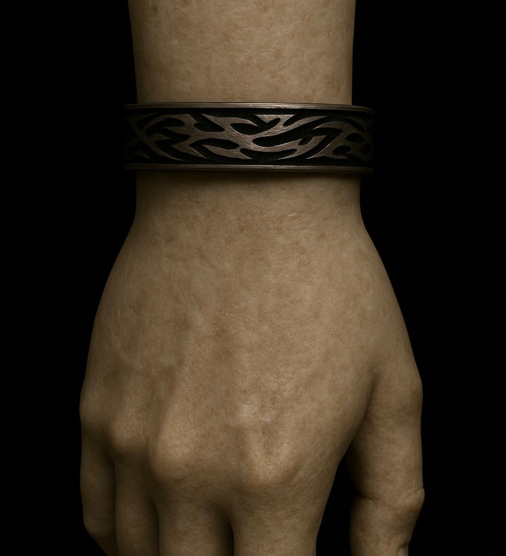 Bransoletka Oldschool Tribal to unikalny dodatek, który łączy w sobie dziedzictwo plemiennych wzorów z oldschoolowym charakterem. Ręcznie wykonana z dbałością o detale, wyróżnia się oryginalnym designem i solidnym wykonaniem. Idealna dla osób ceniących niebanalny styl i chcących wyrazić swoją osobowość poprzez wyraziste akcesoria.